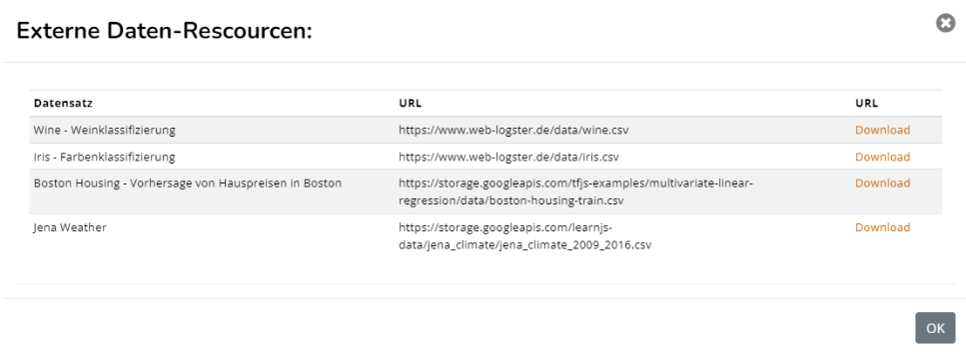 Zentraler Beginn aller Aktionen, ist die die Auswahl des zu analysierenden Datensatzes. Stehen keine eigene Daten im