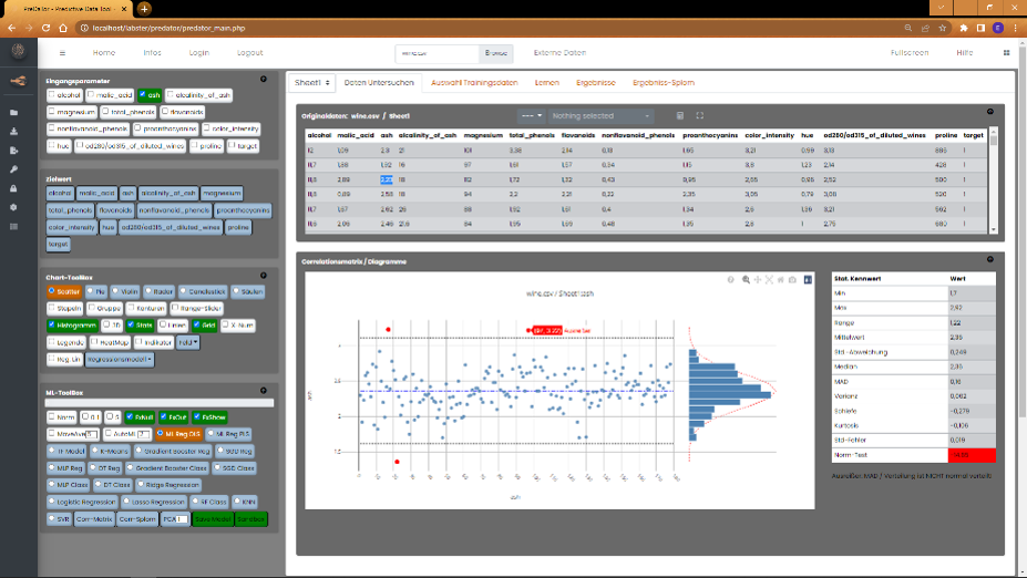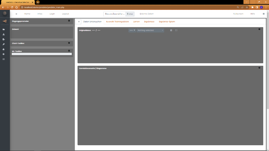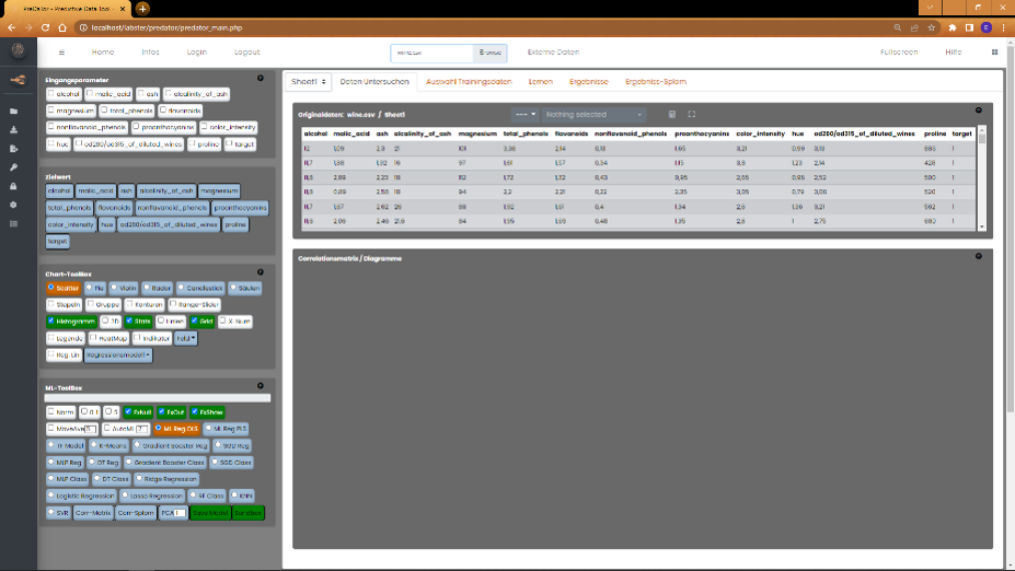 Datenvisualisierung und die Erstellung der ML-Modelle. Rechts oben befinden sich einige Tabs. Nach dem Laden der Daten wird