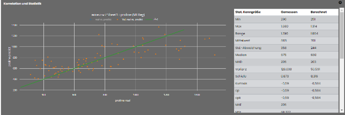 Die Gegenüberstellung des realen zum berechneten Wert des vorherzusagenden Zielparameters ist im Korrelationschart zu sehen. Die grüne Linie hat die theoretische