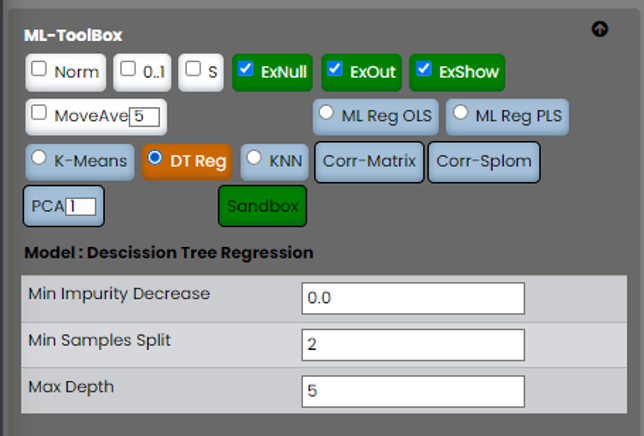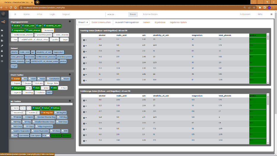 (Mehrfachauswahl), als auch im Feld der Zielgrößen der ML-Modelle. Darunter befinden sich die Tool-Boxen für die