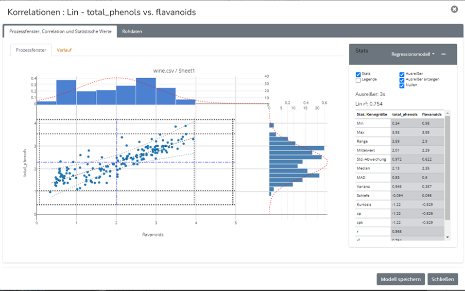 Neben der Punktwolke, den Verteilungen oben und rechts und den statistischen Kennwerten x/, +/-1,2,3 s, wird ebenfalls die