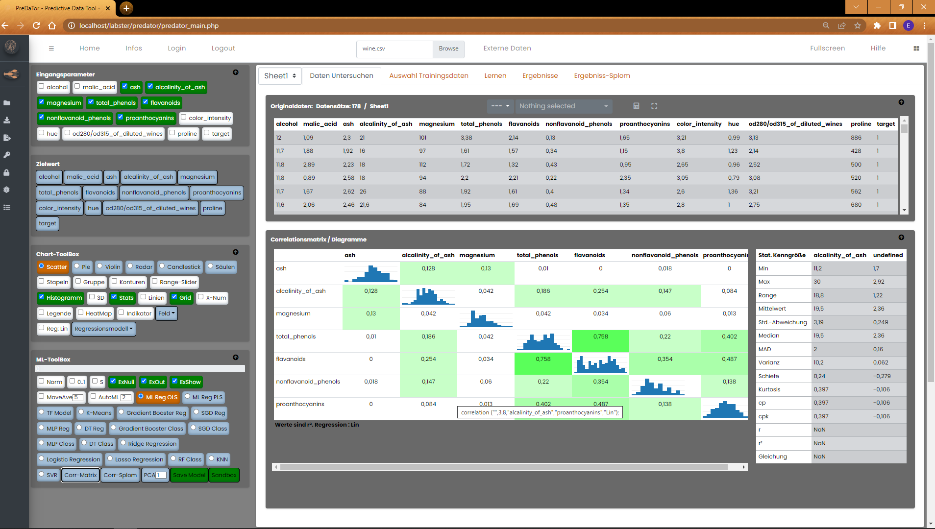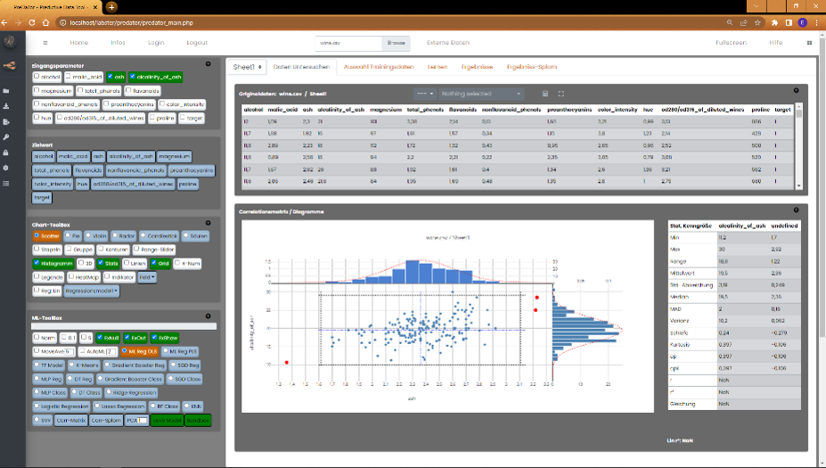 Datenvisualisierung und die Erstellung der ML-Modelle. Rechts oben befinden sich einige Tabs. Nach dem Laden der Daten wird