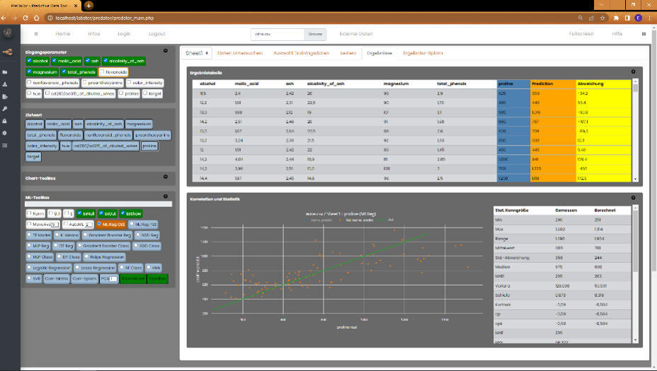 Die einfachste Version eines Datenmodells ist die einfache linare Regression. Diese haben wir schon im Stats-Modul kennengelernt. Soll über mehrere Eingangsparameter ein Ziel korreliert werden, ist in diesem Kontext die multiple lineare Regressionsanalyse eine erste Wahl. Um ein erstes Modell zu erstellen, laden Sie hierzu den entsprechenden Datensatz über den Browse-Button. Es stehen zwei Ansätze für die multiple linerare Regressionsnanalyse zu Verfügung. OLS, Ordinary Least Square und PLS , Partial Least Square. Der mathematisch Hintergrund ist hier zu finden (OLS | PLS). Klicken Sie die Eingangsparameter an, mit denen Sie das Vorhersagemodell erstellen wollen. Klicken Sie in der ML-Toolbox entweder auf PLS oder OLS. Die Funktion Nullen und Ausreißer zu entfernen, ist voreingestellt. (Änderbar im Side-Menu "Einstellungen"). Falls Sie dies nicht wollen, müssen Sie die Funktion explizit deaktivieren. Zum Start der Berechnungssequenz klicken Sie auf den Button des Zielparameters in der Box "Zielwert". Nach der Berechnung ergibt sich folgendes Bild: