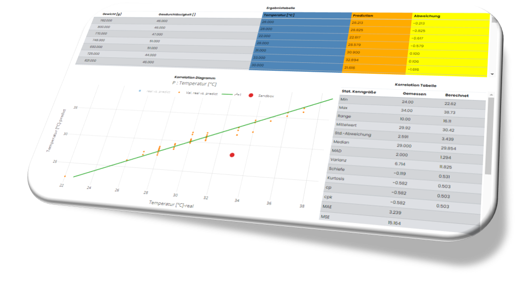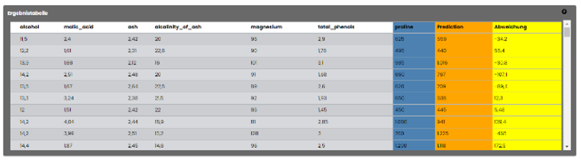 Ergebnisse ebenfalls tabellarisch angezeigt. Die Ergebnistabelle zeigt neben den realen (Trainings-)Eingangsdaten und den realen Werten des Zielparameters