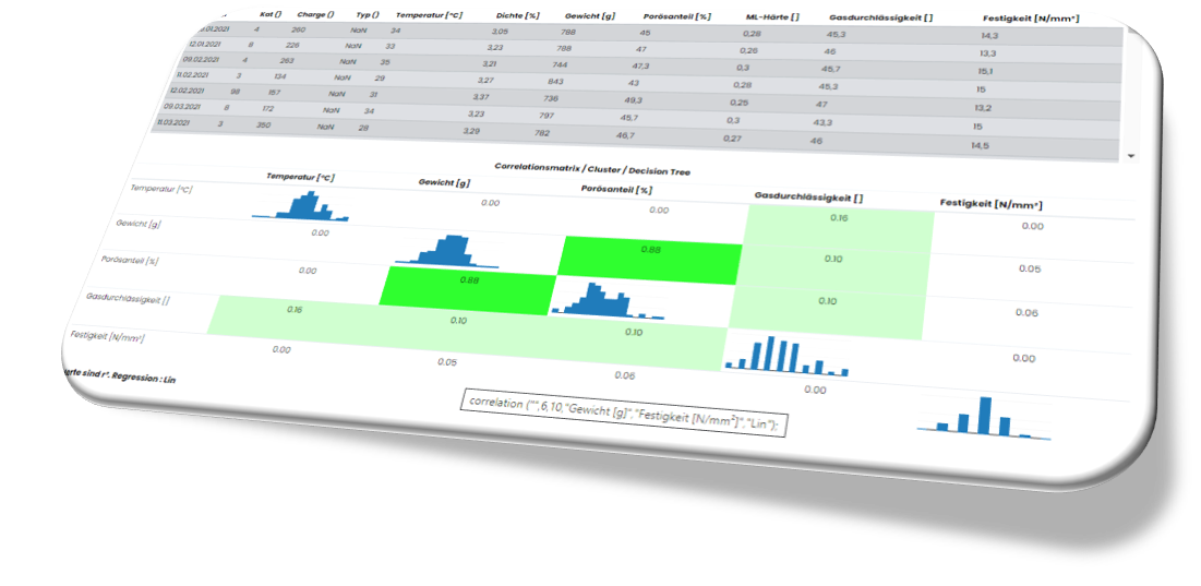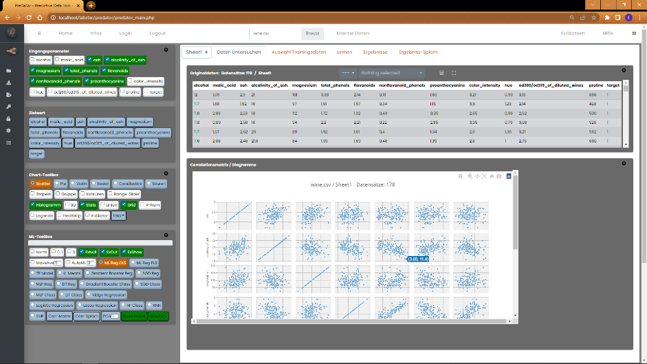 hierfür ausgewählt sein. Nach einem Klick auf "Corr-Matrix" in der ML-Toolbox, erzeugt PreDaTor aus den Daten folgende Matrix-Darstellung.